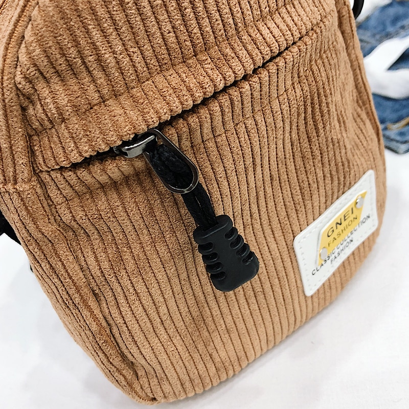 Material: CorduroyLining: PolyesterSize: 12cm(Top Length), 13cm(Bottom Length), 16cm(Height), 6cm(Width) very smallShouder Strap: 120cm