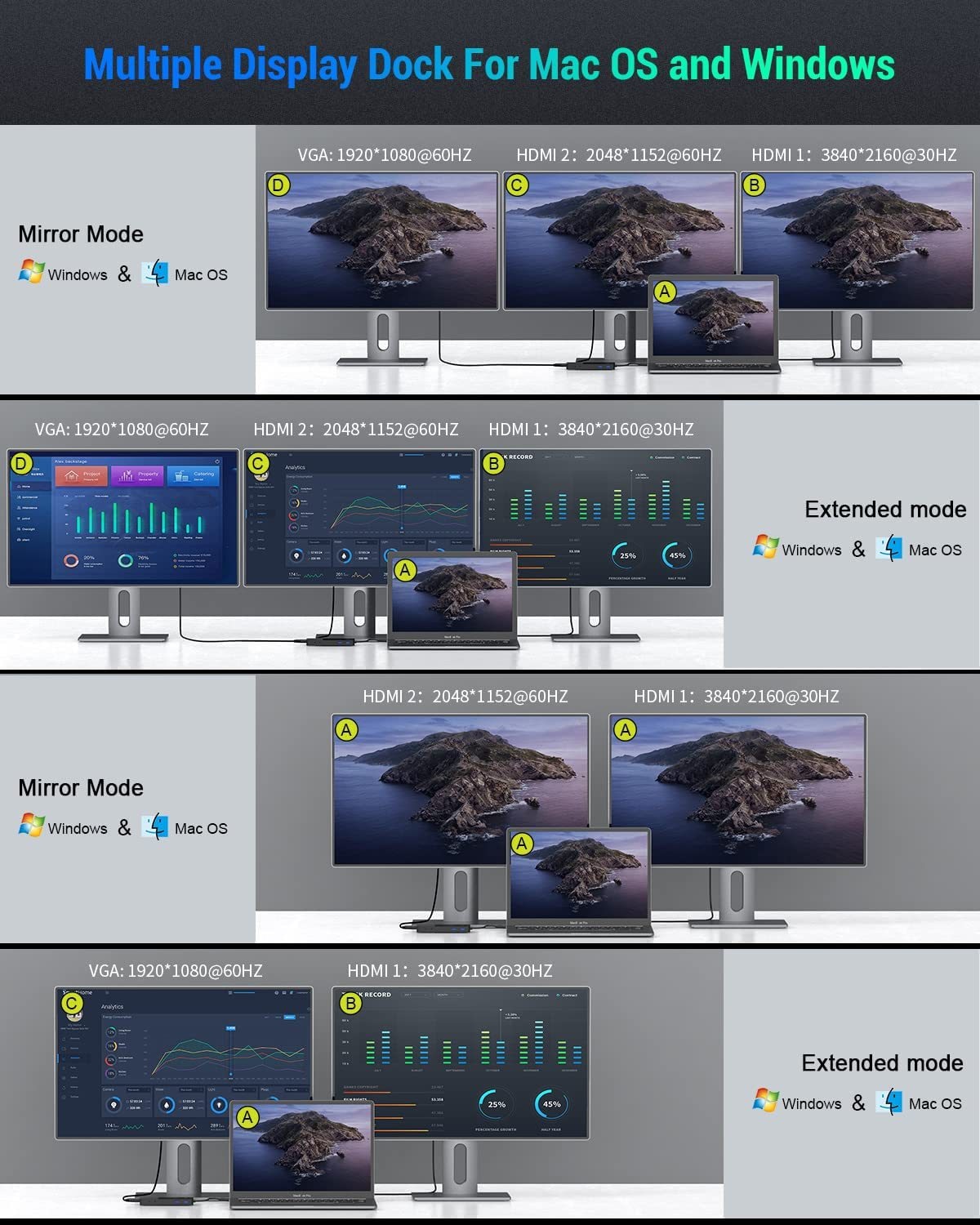 - Quadruple Display USB C HUB: Support docking station dual monitor, and also allow to expand or mirror 3 monitors by a VGA and 2 HDMI video output ports. Single display attached, the max each display resolutions up HDMI 1:4K@30Hz 3840x2160, HDMI2: 2K@60HZ 2048x1152,VGA:1920x1080@60HZ. And 3.5mm audio jack for you to put in your wired microphone and headphone for your awesome musical experience(Note: headphone are only valid for HDMI2 audio)