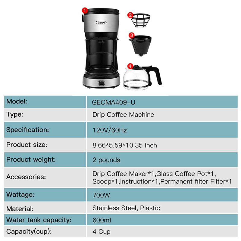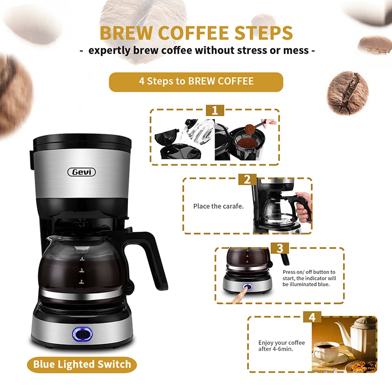 Gevi Drip Coffee Machine 4-Cup Coffee Maker with Auto-Shut Off Coffee Pot Brewer Machine with Cone Filter for Office GECMA409-U