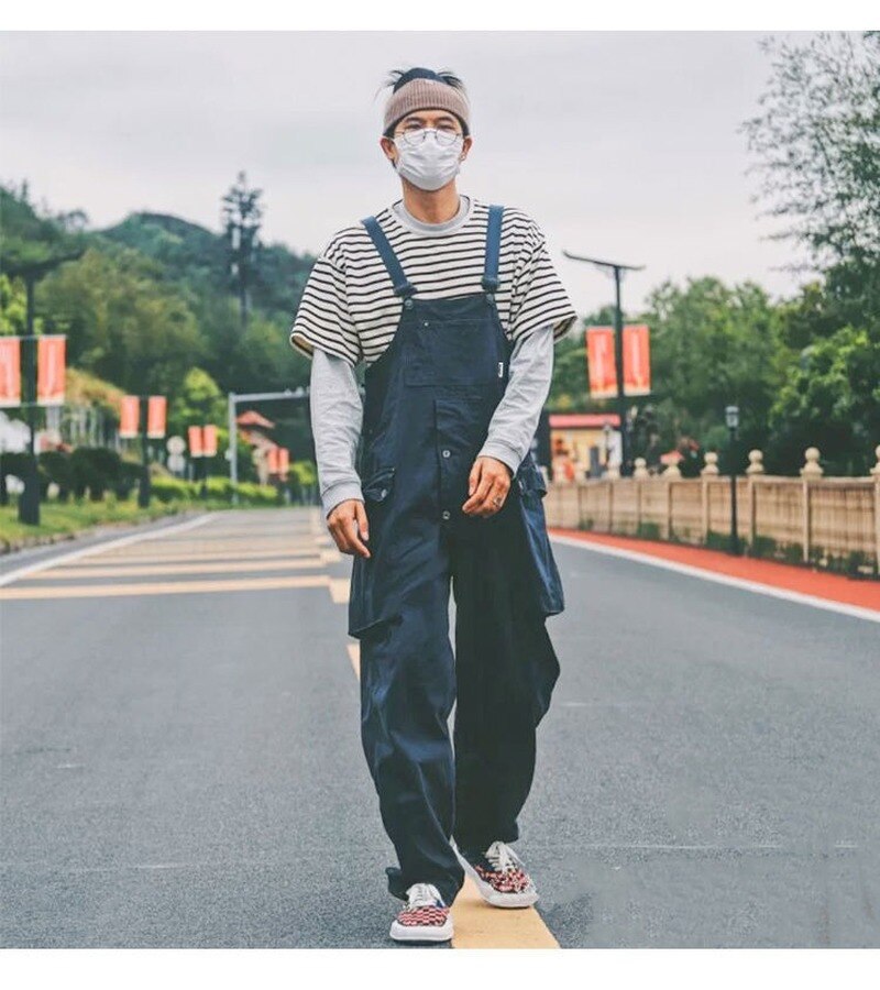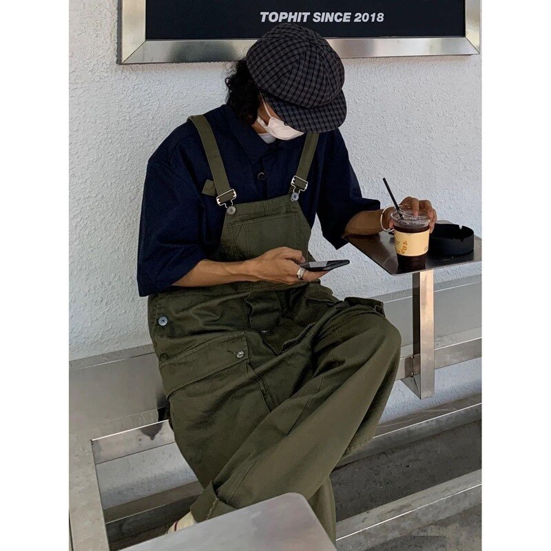 2022 Men's Retro Designer Overalls Workwear Sling Korean Loose Wide Leg Jumpsuit Streetwear Solid Color Men's Clothing