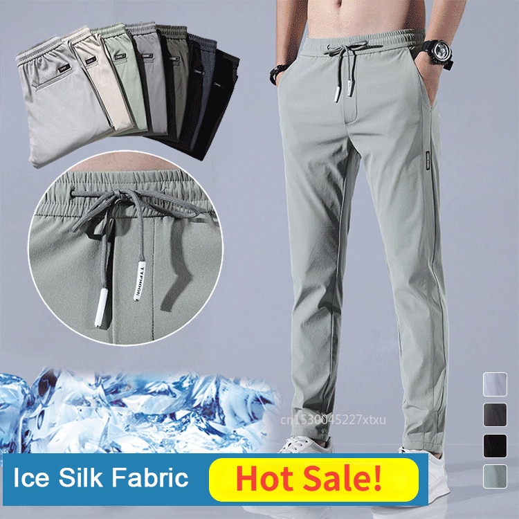 Men Fast Dry Stretch Pants Ice Silk Trousers Solid Color Mid-Waist Loose Breathable Straight-Leg Casual Pants Thin Sports Pants