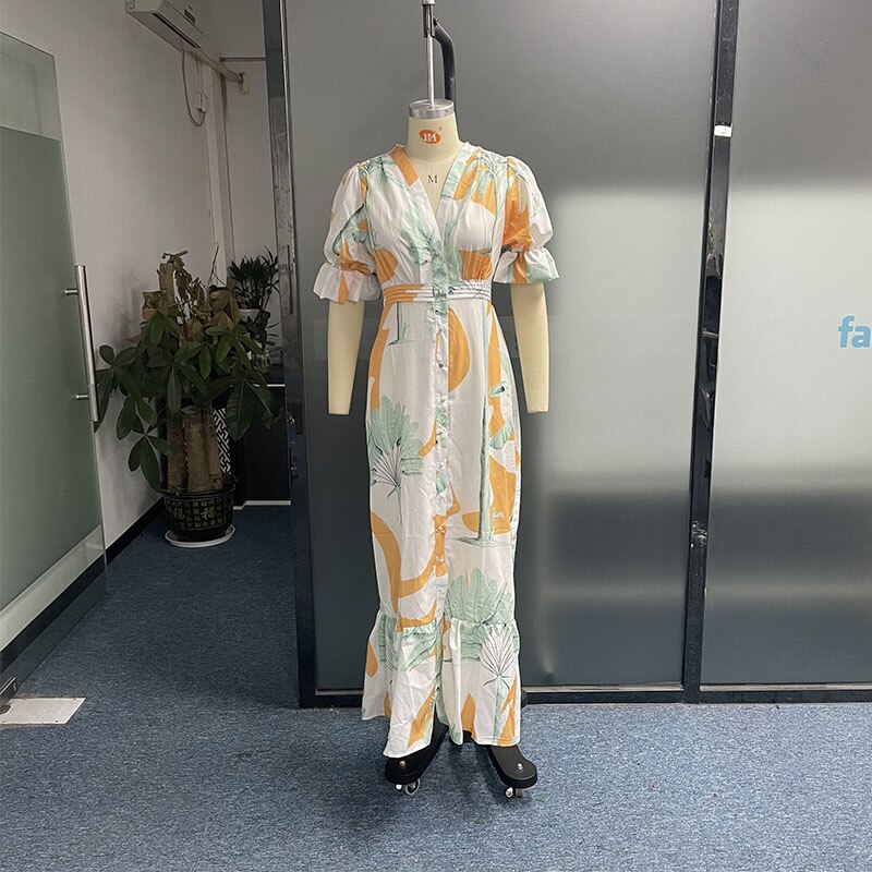 Ellafads Women Maxi Dress Summer Stylish Print Short Puff Sleeve V Neck Nipped Waist Slim Single Row Button Beach Party Dresses