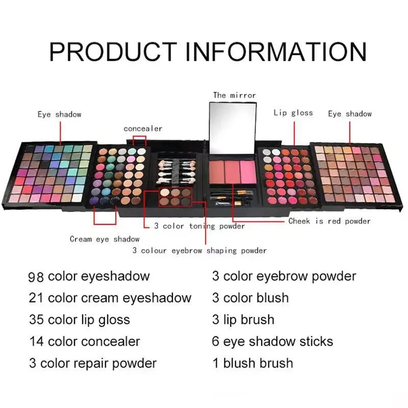 1. 98 shades of pearlescent eye shadow.Pink green blue violet orange yellow earth color system and so on all have.