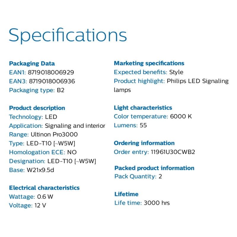 For a stylish drive, upgrade to Philips Ultinon Pro3000 LED [˜W5W] position lights. They are daylight-bright and look good so you can signal safely and stylishly.
