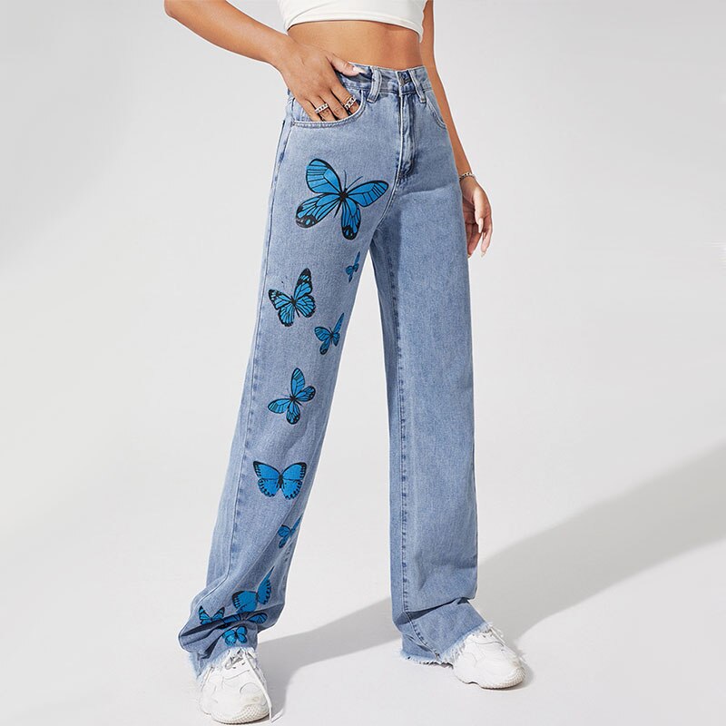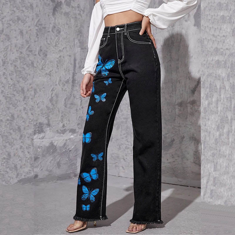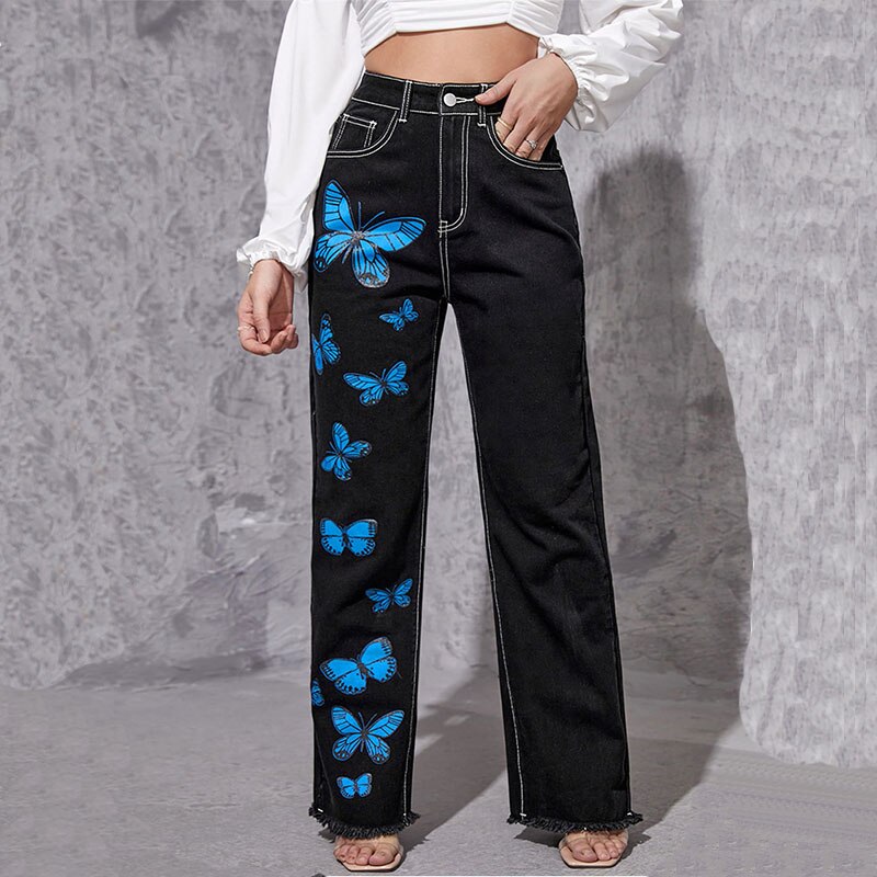 Womens Jeans High Waist Straight Baggy Denim Pants Butterfly Print 2023 Spring Autumn Fashion Streetwear Wide Leg Denim Trouser