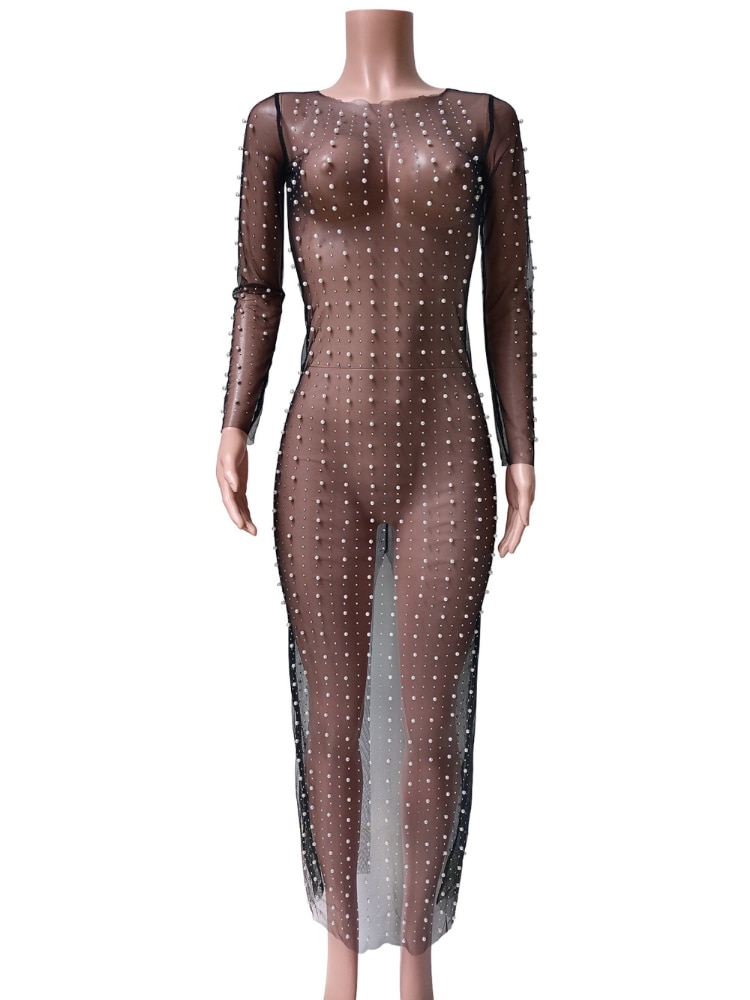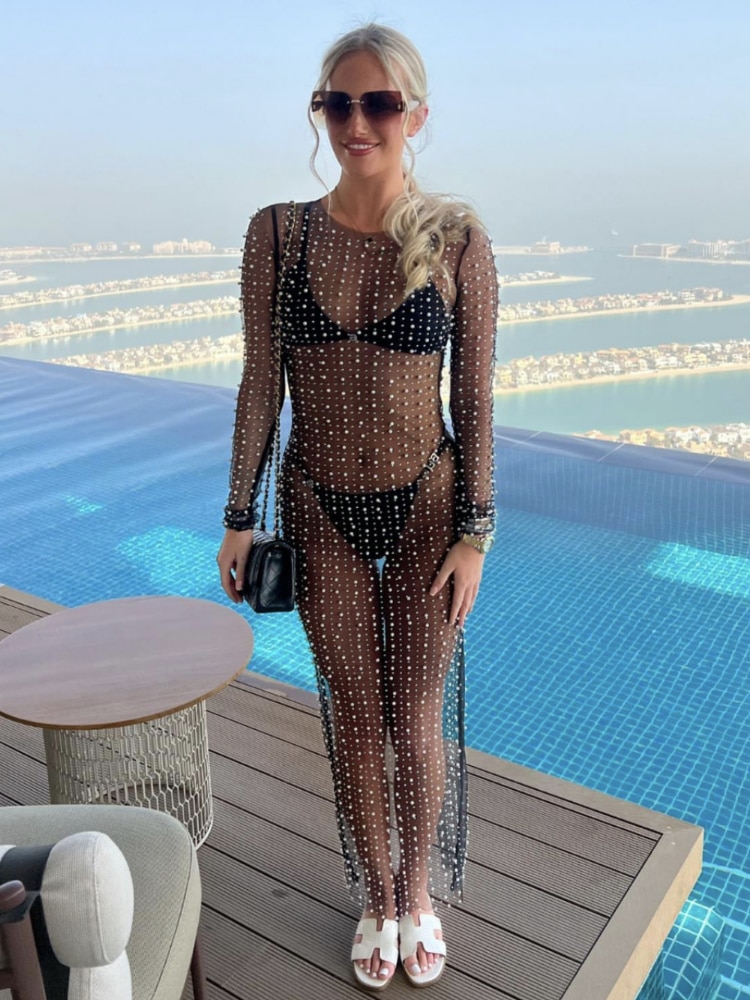 Sexy Mesh See Through Women Dress Summer Fashion Pearl Long Sleeve Vacation Beach Dress Maxi Bodycon Club Outfits 2023 Cover up