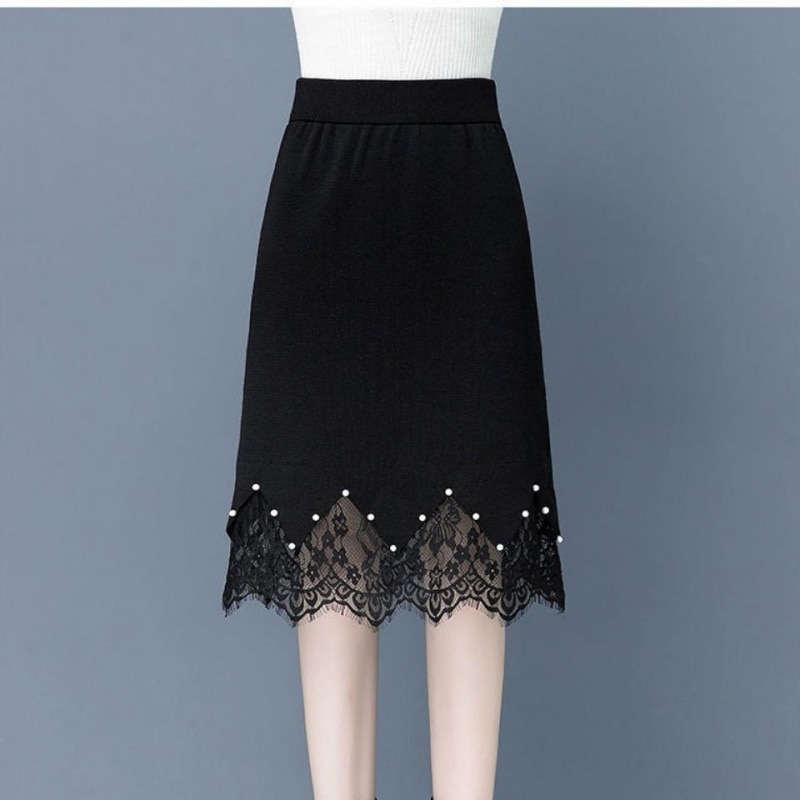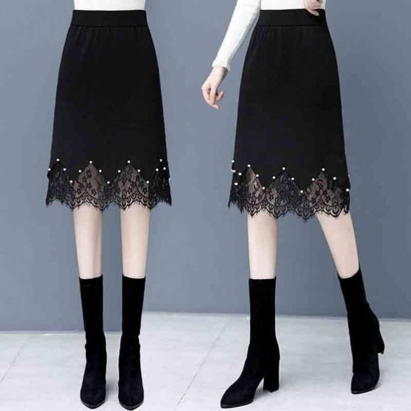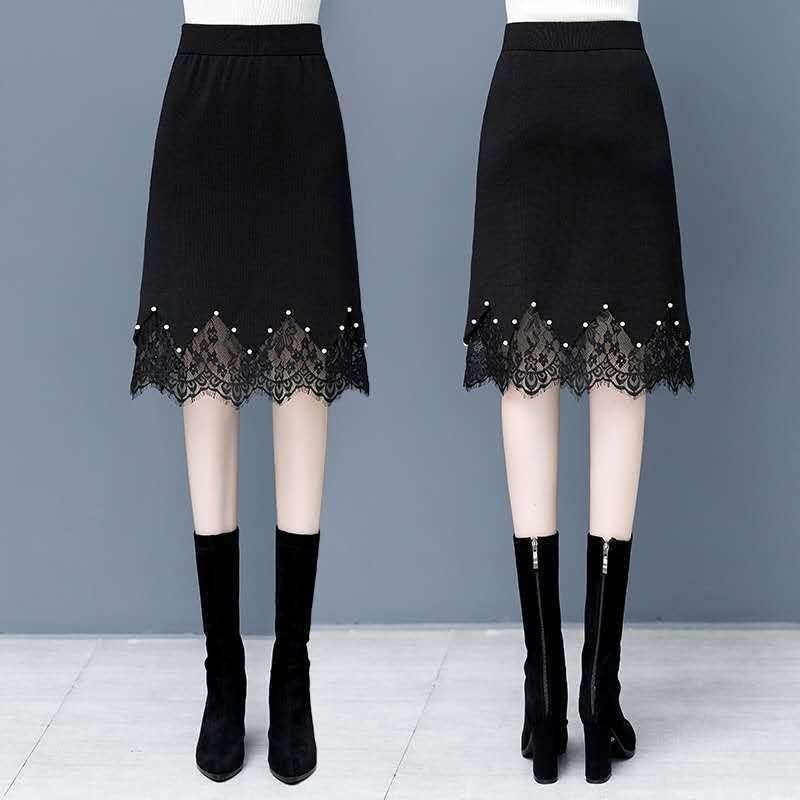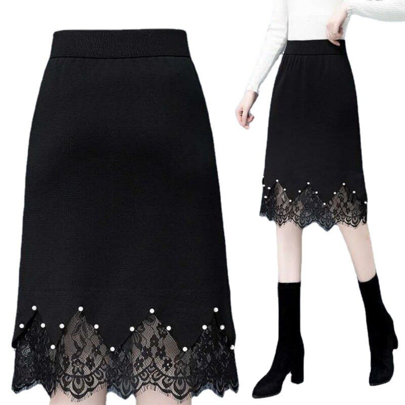 Lace skirt thickened knitted new autumn/winter 2022 high waist step skirt versatile black A-line skirt wholesale