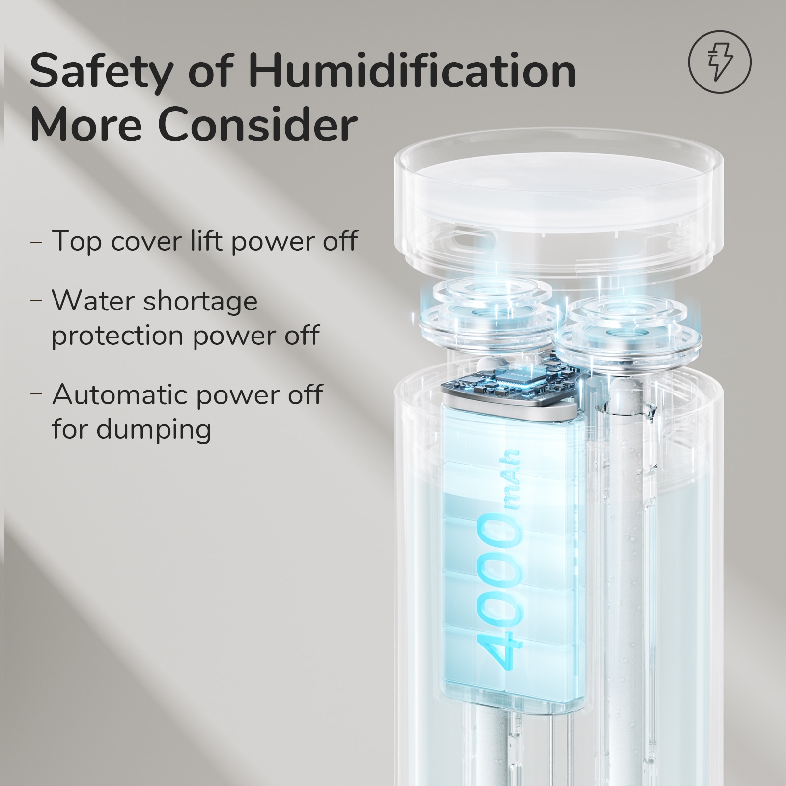 • 【Safety of Humidification, More Consider】JISULIFE battery operated humidifier uses smart chip and physical probe to provide triple anti-dry burn protection, top cover lift power off, water shortage protection power off and dumping automatic power off, safe and easy to use.