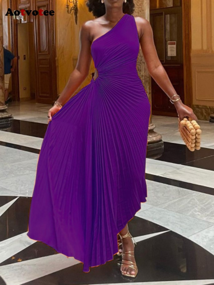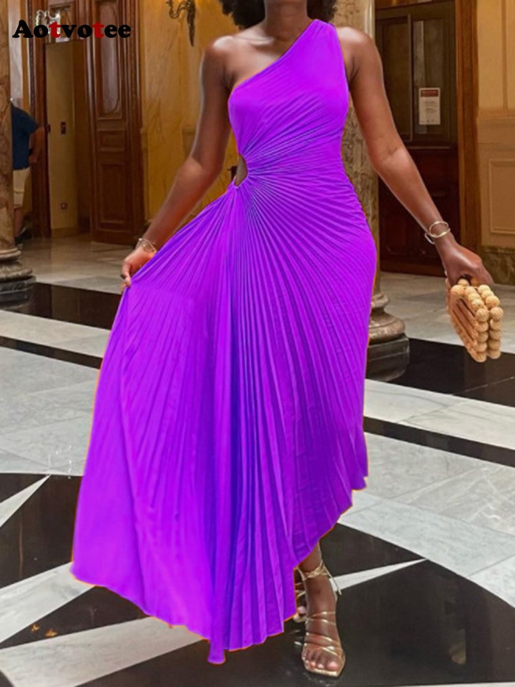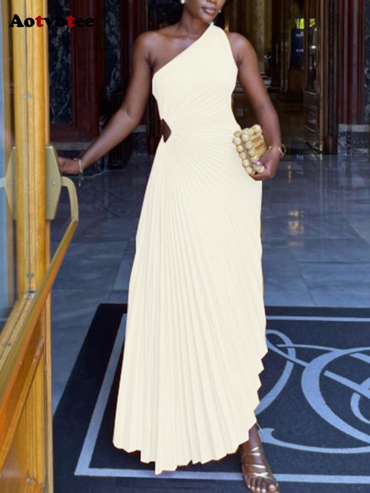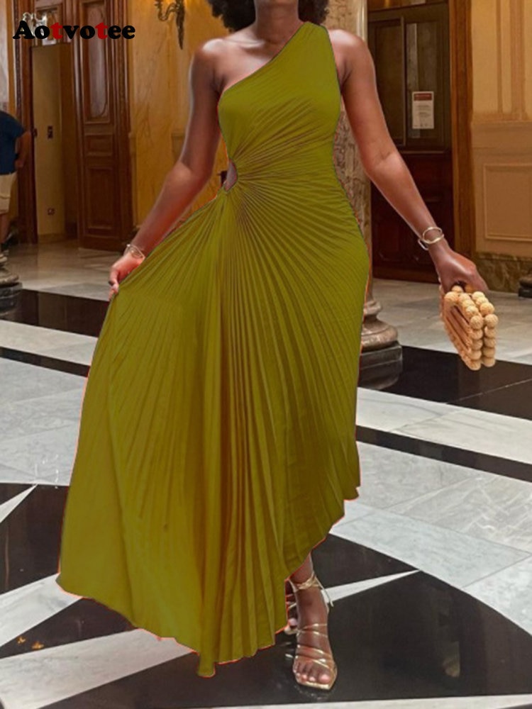 Aotvotee Women Dress One Shoulder Orange Sleeveless Diagonal Collar Pleated A-Line Dresses Sexy Party Prom Evening Vestidos 2023