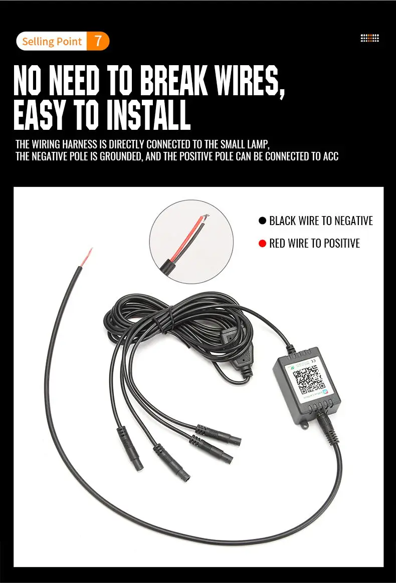 7.No need to break the wire, simple installation, the wire harness is directly connected to the small lamp, the negative pole is grounded, and the positive pole can be connected to ACC
