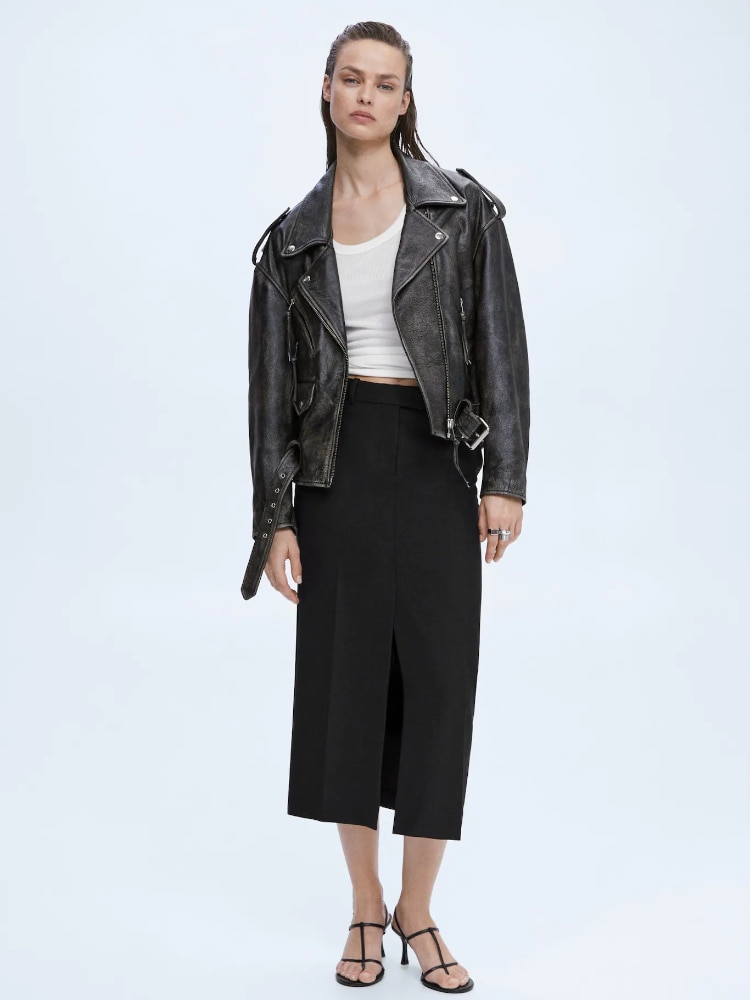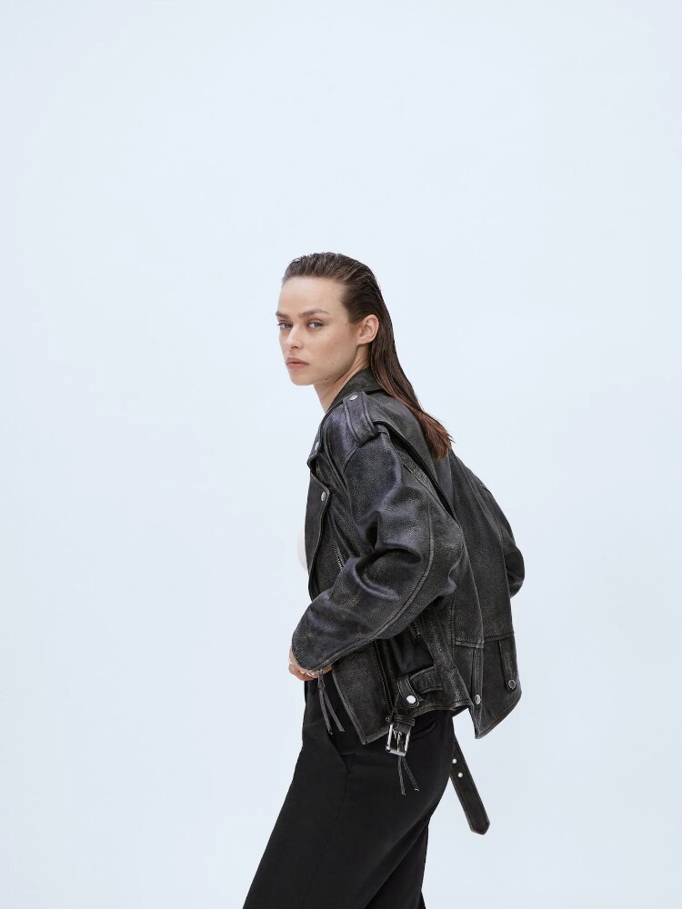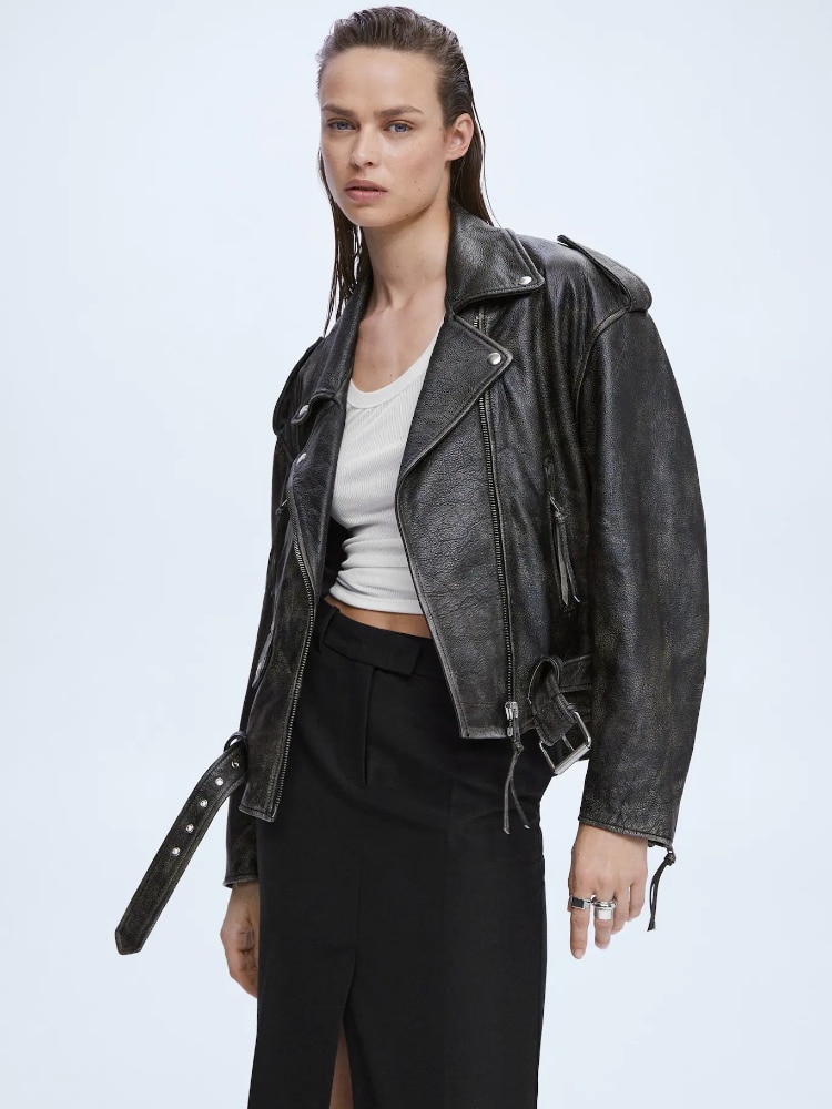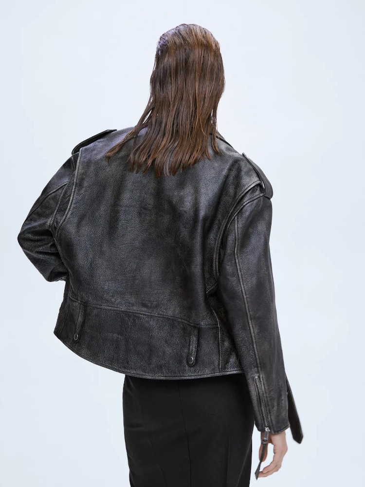 RR2378 Dirty Pu Leather Biker Jackets Womens Oversize Boyfriend Bomber Jacket Ladies Loops on the Shoulders Black Coats