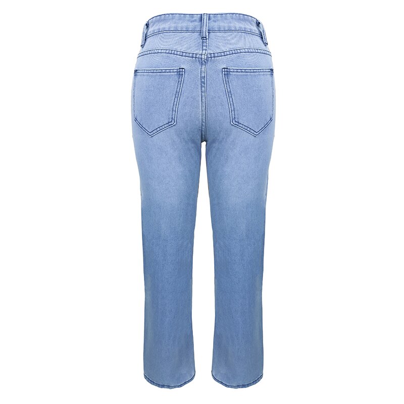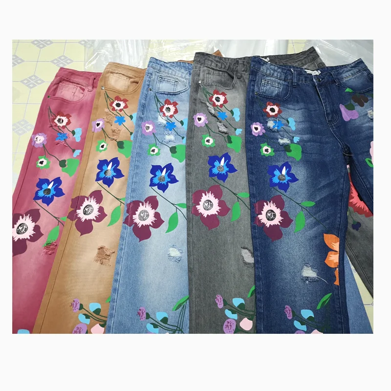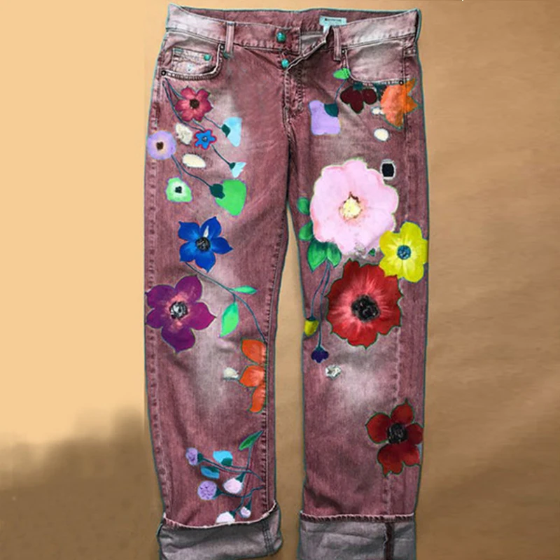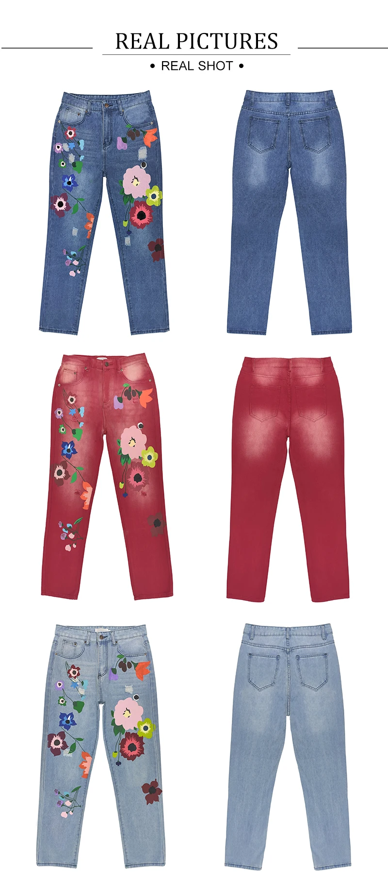 Streetwear Ladies Pants High Waist Retro Blue Casual Printed Flower Women's Wahed Straight Leg Mom's Work Jeans